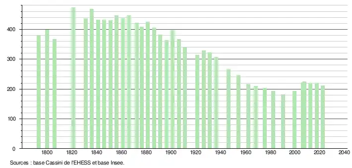 L'évolution du nombre d'habitants est connue à travers les recensements de la population effectués dans la commune depuis 1793. Pour les communes de moins de 10 000 habitants, une enquête de recensement portant sur toute la population est réalisée tous les cinq ans, les populations de référence des années intermédiaires étant quant à elles estimées par interpolation ou extrapolation[39]. Pour la commune, le premier recensement exhaustif entrant dans le cadre du nouveau dispositif a été réalisé en 2007[40].