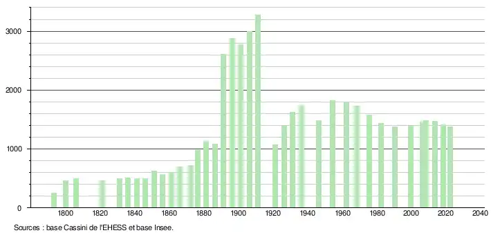 L'évolution du nombre d'habitants est connue à travers les recensements de la population effectués dans la commune depuis 1793. Pour les communes de moins de 10 000 habitants, une enquête de recensement portant sur toute la population est réalisée tous les cinq ans, les populations de référence des années intermédiaires étant quant à elles estimées par interpolation ou extrapolation[24]. Pour la commune, le premier recensement exhaustif entrant dans le cadre du nouveau dispositif a été réalisé en 2008[25].