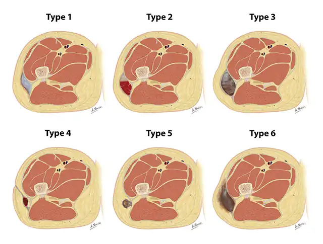 La lésion se situe généralement au niveau de la cuisse ou du bassin ; même si d'autres régions du corps peuvent être impliquées[1]. Les symptômes comprennent des ecchymoses, une mobilité cutanée accrue et un gonflement[1]. Cela peut ne pas apparaître avant quelques jours[1]. Les complications peuvent consister en une infection ou une anomalie de la zone concernée[1].