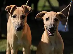 Comparatif de taille entre whippet (♂) et greyhound (♀).