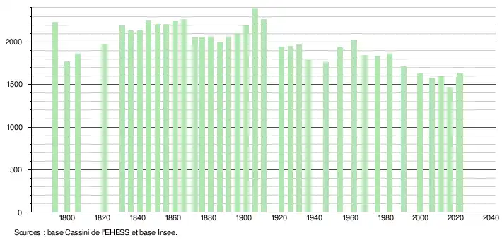 L'évolution du nombre d'habitants est connue à travers les recensements de la population effectués dans la commune depuis 1793. Pour les communes de moins de 10 000 habitants, une enquête de recensement portant sur toute la population est réalisée tous les cinq ans, les populations de référence des années intermédiaires étant quant à elles estimées par interpolation ou extrapolation[31]. Pour la commune, le premier recensement exhaustif entrant dans le cadre du nouveau dispositif a été réalisé en 2006[32].