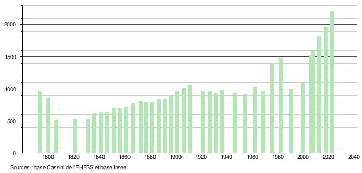 L'évolution du nombre d'habitants est connue à travers les recensements de la population effectués dans la commune depuis 1793. Pour les communes de moins de 10 000 habitants, une enquête de recensement portant sur toute la population est réalisée tous les cinq ans, les populations de référence des années intermédiaires étant quant à elles estimées par interpolation ou extrapolation[21]. Pour la commune, le premier recensement exhaustif entrant dans le cadre du nouveau dispositif a été réalisé en 2007[22].