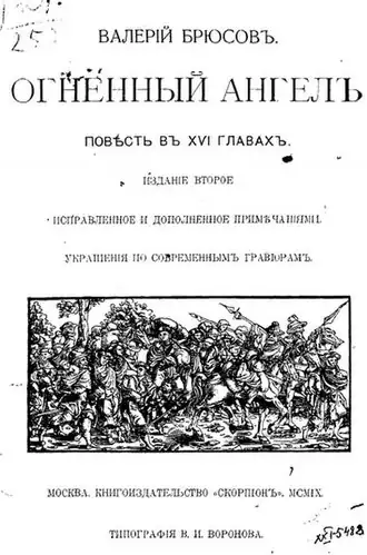 La première édition de l'Ange de feu a été conçue comme un canular. Dans l'avant-propos contenant une analyse du contexte historique, Brioussov est présenté comme l'éditeur et le traducteur de l'allemand vers le russe d'un manuscrit original du XVIe siècle. Le texte de ce document historique imaginaire étant accompagné de nombreuses notes.