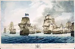 L'Achille (à gauche) démâté par le HMS Brunswick lors de la bataille de Prairial. | |