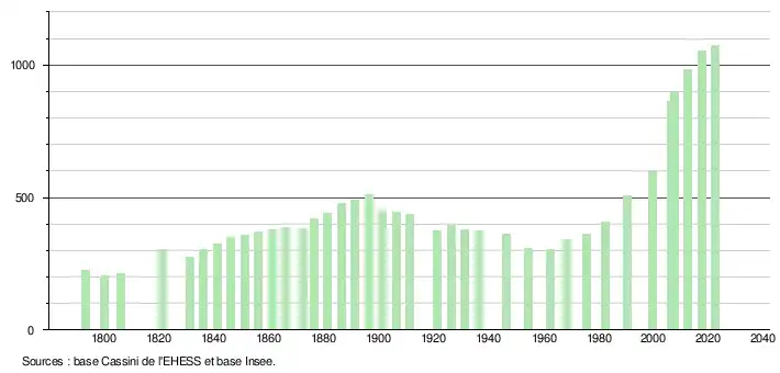 L'évolution du nombre d'habitants est connue à travers les recensements de la population effectués dans la commune depuis 1793. Pour les communes de moins de 10 000 habitants, une enquête de recensement portant sur toute la population est réalisée tous les cinq ans, les populations de référence des années intermédiaires étant quant à elles estimées par interpolation ou extrapolation[14]. Pour la commune, le premier recensement exhaustif entrant dans le cadre du nouveau dispositif a été réalisé en 2007[15].