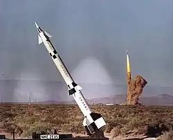 Un missile Nike Zeus B se trouve en présentation statique à White Sands alors qu'un autre Zeus B à l'arrière plan est lancé à l'occasion d'un test.