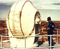L'émetteur triangulaire du Zeus Acquisition Radar (ZAR) est visible au premier plan, l'antenne de réception couverte par un dôme est visible à l'arrière plan.
