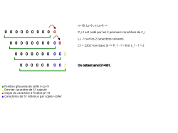 - Ci,1 est la représentation en base α (α étant la taille de l'alphabet des caractères de S) de pi-1, avec pi l'indice dans la fenêtre glissante où commence la copie qui correspond à Si (pi est le pointeur pour la production de Si).