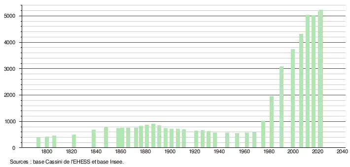 L'évolution du nombre d'habitants est connue à travers les recensements de la population effectués dans la commune depuis 1793. Pour les communes de moins de 10 000 habitants, une enquête de recensement portant sur toute la population est réalisée tous les cinq ans, les populations de référence des années intermédiaires étant quant à elles estimées par interpolation ou extrapolation[20]. Pour la commune, le premier recensement exhaustif entrant dans le cadre du nouveau dispositif a été réalisé en 2006[21].