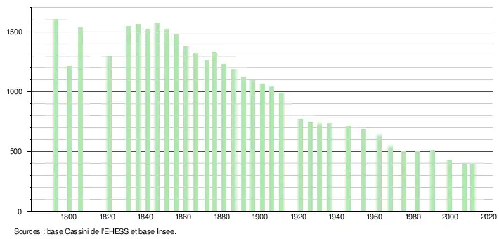- ↑ Dans le tableau des recensements et le graphique, par convention dans Wikipédia, le principe a été retenu, pour les populations légales postérieures à 1999 de n’afficher dans le tableau des recensements et le graphique que les populations correspondant à l'année 2006, première population légale publiée calculée conformément aux concepts définis dans le décret no 2003-485 du 5 juin 2003, et les années correspondant à une enquête exhaustive de recensement pour les communes de moins de 10 000 habitants, ainsi que la dernière population légale publiée par l’Insee.
