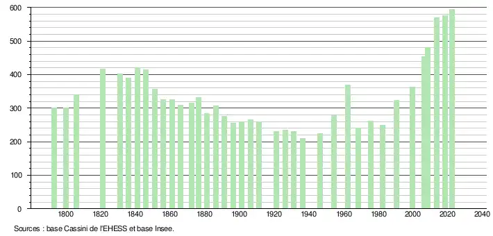 L'évolution du nombre d'habitants est connue à travers les recensements de la population effectués dans la commune depuis 1793. Pour les communes de moins de 10 000 habitants, une enquête de recensement portant sur toute la population est réalisée tous les cinq ans, les populations de référence des années intermédiaires étant quant à elles estimées par interpolation ou extrapolation[21]. Pour la commune, le premier recensement exhaustif entrant dans le cadre du nouveau dispositif a été réalisé en 2008[22].