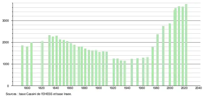 L'évolution du nombre d'habitants est connue à travers les recensements de la population effectués dans la commune depuis 1793. Pour les communes de moins de 10 000 habitants, une enquête de recensement portant sur toute la population est réalisée tous les cinq ans, les populations de référence des années intermédiaires étant quant à elles estimées par interpolation ou extrapolation[19]. Pour la commune, le premier recensement exhaustif entrant dans le cadre du nouveau dispositif a été réalisé en 2007[20].