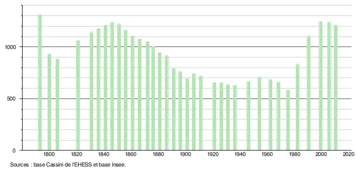 L'évolution du nombre d'habitants est connue à travers les recensements de la population effectués dans la commune depuis 1793. À partir du , les populations légales des communes sont publiées annuellement dans le cadre d'un recensement qui repose désormais sur une collecte d'information annuelle, concernant successivement tous les territoires communaux au cours d'une période de cinq ans. Pour les communes de moins de 10 000 habitants, une enquête de recensement portant sur toute la population est réalisée tous les cinq ans, les populations légales des années intermédiaires étant quant à elles estimées par interpolation ou extrapolation[20]. Pour la commune, le premier recensement exhaustif entrant dans le cadre du nouveau dispositif a été réalisé en 2005[21],[Note 1].