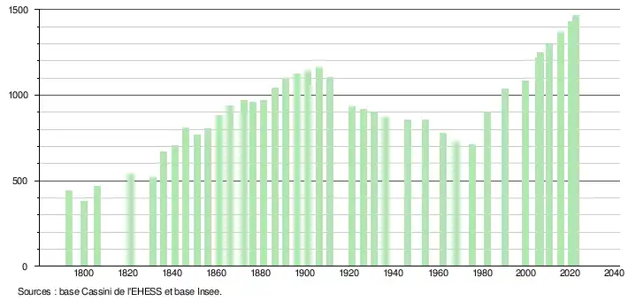L'évolution du nombre d'habitants est connue à travers les recensements de la population effectués dans la commune depuis 1793. Pour les communes de moins de 10 000 habitants, une enquête de recensement portant sur toute la population est réalisée tous les cinq ans, les populations de référence des années intermédiaires étant quant à elles estimées par interpolation ou extrapolation[18]. Pour la commune, le premier recensement exhaustif entrant dans le cadre du nouveau dispositif a été réalisé en 2005[19].