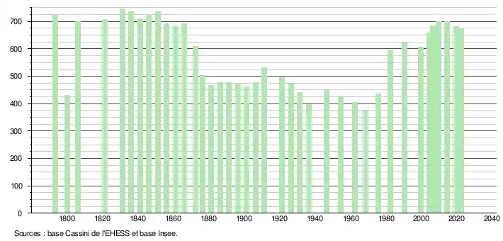 L'évolution du nombre d'habitants est connue à travers les recensements de la population effectués dans la commune depuis 1793. Pour les communes de moins de 10 000 habitants, une enquête de recensement portant sur toute la population est réalisée tous les cinq ans, les populations de référence des années intermédiaires étant quant à elles estimées par interpolation ou extrapolation[19]. Pour la commune, le premier recensement exhaustif entrant dans le cadre du nouveau dispositif a été réalisé en 2004[20].