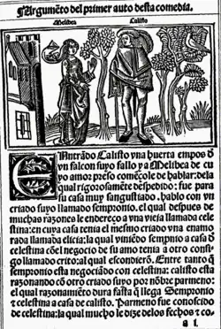 Calixte, jeune homme de noble naissance, d’un esprit distingué, d’agréable tournure, d’une éducation peu commune, d’une fortune moyenne, est pris d’amour pour Mélibée, jeune fille d’une grande beauté, d’une naissance haute et pure, possédant une grande fortune, unique héritière de son père Plebère et tendrement aimée par sa mère Alisa. Calixte poursuit Mélibée des plus vives instances, et, aidé par Célestine (femme méchante et rusée à laquelle se joignent deux serviteurs de Calixte qu’elle a séduits et rendus infidèles par l’appât du plaisir et du profit), il parvient à vaincre la chaste résistance de la jeune fille. Les amants et ceux qui les aident ont une fin malheureuse et amère. Le commencement de cette triste histoire est l’œuvre du hasard, qui méchamment met Calixte en présence de celle qu’il aime.