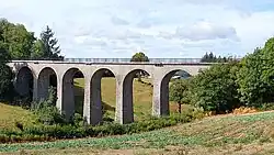 Viaduc de La Cellette[27], de l'ancienne ligne ferroviaire Montluçon - Gouttières : 122 m de longueur - 21 m de hauteur, et composé de 8 arches de 10 m