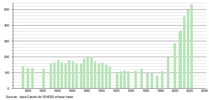 L'évolution du nombre d'habitants est connue à travers les recensements de la population effectués dans la commune depuis 1793. Pour les communes de moins de 10 000 habitants, une enquête de recensement portant sur toute la population est réalisée tous les cinq ans, les populations de référence des années intermédiaires étant quant à elles estimées par interpolation ou extrapolation[18]. Pour la commune, le premier recensement exhaustif entrant dans le cadre du nouveau dispositif a été réalisé en 2007[19].