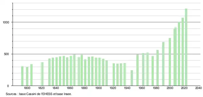 L'évolution du nombre d'habitants est connue à travers les recensements de la population effectués dans la commune depuis 1793. Pour les communes de moins de 10 000 habitants, une enquête de recensement portant sur toute la population est réalisée tous les cinq ans, les populations de référence des années intermédiaires étant quant à elles estimées par interpolation ou extrapolation[18]. Pour la commune, le premier recensement exhaustif entrant dans le cadre du nouveau dispositif a été réalisé en 2007[19].