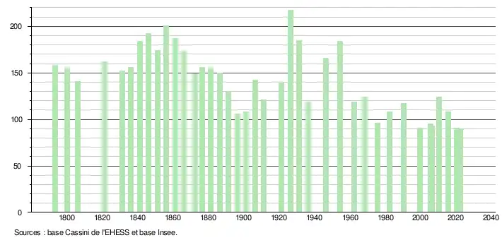 L'évolution du nombre d'habitants est connue à travers les recensements de la population effectués dans la commune depuis 1793. Pour les communes de moins de 10 000 habitants, une enquête de recensement portant sur toute la population est réalisée tous les cinq ans, les populations de référence des années intermédiaires étant quant à elles estimées par interpolation ou extrapolation[21]. Pour la commune, le premier recensement exhaustif entrant dans le cadre du nouveau dispositif a été réalisé en 2005[22].