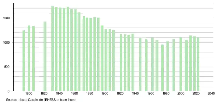 L'évolution du nombre d'habitants est connue à travers les recensements de la population effectués dans la commune depuis 1793. Pour les communes de moins de 10 000 habitants, une enquête de recensement portant sur toute la population est réalisée tous les cinq ans, les populations de référence des années intermédiaires étant quant à elles estimées par interpolation ou extrapolation[29]. Pour la commune, le premier recensement exhaustif entrant dans le cadre du nouveau dispositif a été réalisé en 2007[30].