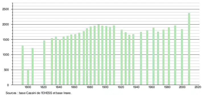 L'évolution du nombre d'habitants est connue à travers les recensements de la population effectués dans la commune depuis 1793. À partir du , les populations légales des communes sont publiées annuellement dans le cadre d'un recensement qui repose désormais sur une collecte d'information annuelle, concernant successivement tous les territoires communaux au cours d'une période de cinq ans. Pour les communes de moins de 10 000 habitants, une enquête de recensement portant sur toute la population est réalisée tous les cinq ans, les populations légales des années intermédiaires étant quant à elles estimées par interpolation ou extrapolation[10]. Pour la commune, le premier recensement exhaustif entrant dans le cadre du nouveau dispositif a été réalisé en 2008[11],[Note 1].