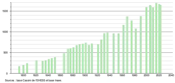 L'évolution du nombre d'habitants est connue à travers les recensements de la population effectués dans la commune depuis 1793. Pour les communes de moins de 10 000 habitants, une enquête de recensement portant sur toute la population est réalisée tous les cinq ans, les populations de référence des années intermédiaires étant quant à elles estimées par interpolation ou extrapolation[25]. Pour la commune, le premier recensement exhaustif entrant dans le cadre du nouveau dispositif a été réalisé en 2005[26].