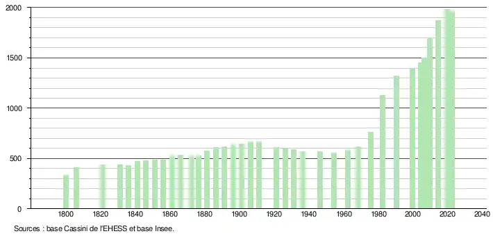 L'évolution du nombre d'habitants est connue à travers les recensements de la population effectués dans la commune depuis 1800. Pour les communes de moins de 10 000 habitants, une enquête de recensement portant sur toute la population est réalisée tous les cinq ans, les populations de référence des années intermédiaires étant quant à elles estimées par interpolation ou extrapolation[22]. Pour la commune, le premier recensement exhaustif entrant dans le cadre du nouveau dispositif a été réalisé en 2004[23].
