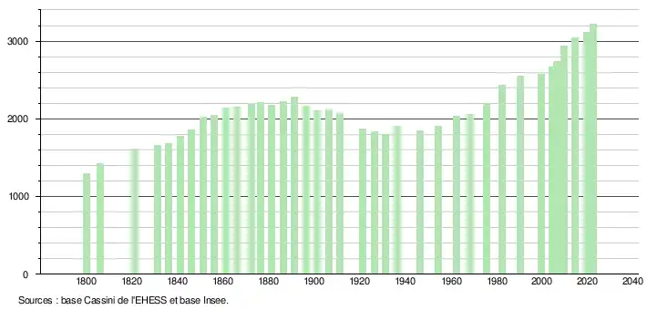 L'évolution du nombre d'habitants est connue à travers les recensements de la population effectués dans la commune depuis 1800. Pour les communes de moins de 10 000 habitants, une enquête de recensement portant sur toute la population est réalisée tous les cinq ans, les populations de référence des années intermédiaires étant quant à elles estimées par interpolation ou extrapolation[25]. Pour la commune, le premier recensement exhaustif entrant dans le cadre du nouveau dispositif a été réalisé en 2004[26].