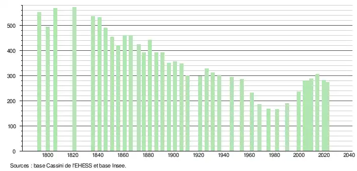 L'évolution du nombre d'habitants est connue à travers les recensements de la population effectués dans la commune depuis 1793. Pour les communes de moins de 10 000 habitants, une enquête de recensement portant sur toute la population est réalisée tous les cinq ans, les populations de référence des années intermédiaires étant quant à elles estimées par interpolation ou extrapolation[26]. Pour la commune, le premier recensement exhaustif entrant dans le cadre du nouveau dispositif a été réalisé en 2004[27].