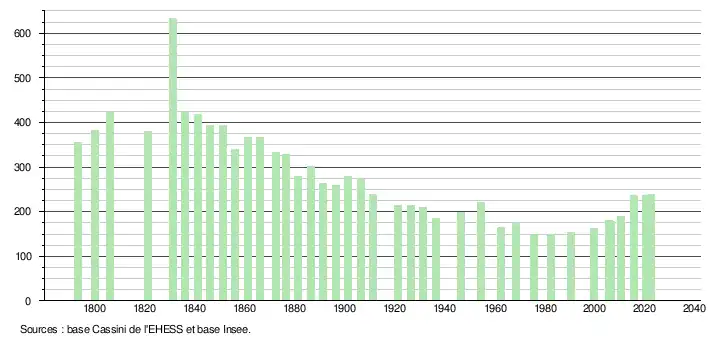 L'évolution du nombre d'habitants est connue à travers les recensements de la population effectués dans la commune depuis 1793. Pour les communes de moins de 10 000 habitants, une enquête de recensement portant sur toute la population est réalisée tous les cinq ans, les populations de référence des années intermédiaires étant quant à elles estimées par interpolation ou extrapolation[28]. Pour la commune, le premier recensement exhaustif entrant dans le cadre du nouveau dispositif a été réalisé en 2005[29].
