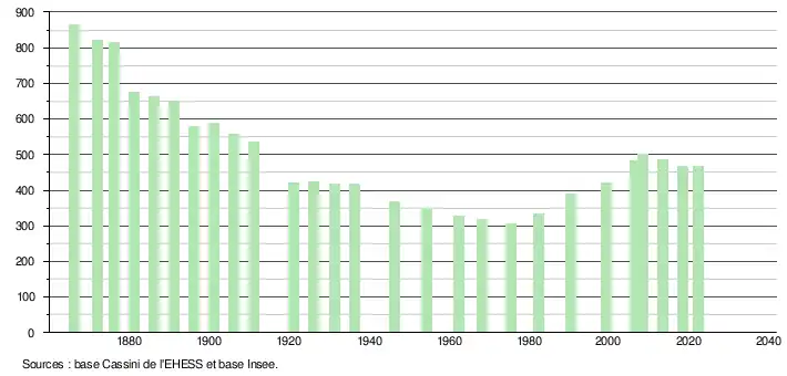 L'évolution du nombre d'habitants est connue à travers les recensements de la population effectués dans la commune depuis 1866. Pour les communes de moins de 10 000 habitants, une enquête de recensement portant sur toute la population est réalisée tous les cinq ans, les populations de référence des années intermédiaires étant quant à elles estimées par interpolation ou extrapolation[20]. Pour la commune, le premier recensement exhaustif entrant dans le cadre du nouveau dispositif a été réalisé en 2008[21].