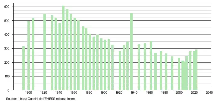 L'évolution du nombre d'habitants est connue à travers les recensements de la population effectués dans la commune depuis 1793. Pour les communes de moins de 10 000 habitants, une enquête de recensement portant sur toute la population est réalisée tous les cinq ans, les populations de référence des années intermédiaires étant quant à elles estimées par interpolation ou extrapolation[30]. Pour la commune, le premier recensement exhaustif entrant dans le cadre du nouveau dispositif a été réalisé en 2004[31].
