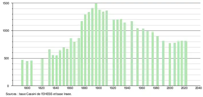 L'évolution du nombre d'habitants est connue à travers les recensements de la population effectués dans la commune depuis 1793. Pour les communes de moins de 10 000 habitants, une enquête de recensement portant sur toute la population est réalisée tous les cinq ans, les populations de référence des années intermédiaires étant quant à elles estimées par interpolation ou extrapolation[14]. Pour la commune, le premier recensement exhaustif entrant dans le cadre du nouveau dispositif a été réalisé en 2006[15].