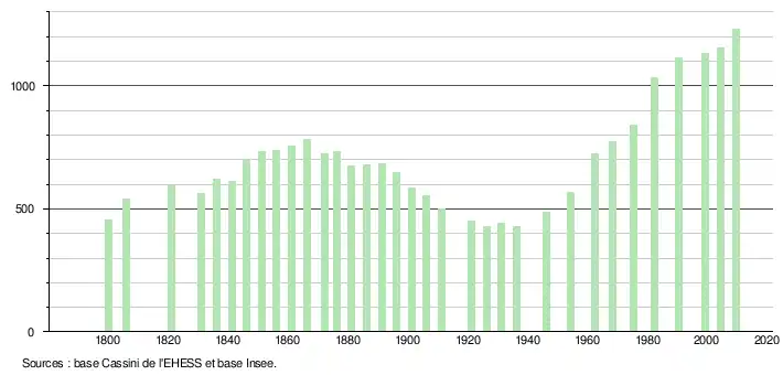 L'évolution du nombre d'habitants est connue à travers les recensements de la population effectués dans la commune depuis 1800. À partir du , les populations légales des communes sont publiées annuellement dans le cadre d'un recensement qui repose désormais sur une collecte d'information annuelle, concernant successivement tous les territoires communaux au cours d'une période de cinq ans. Pour les communes de moins de 10 000 habitants, une enquête de recensement portant sur toute la population est réalisée tous les cinq ans, les populations légales des années intermédiaires étant quant à elles estimées par interpolation ou extrapolation[13]. Pour la commune, le premier recensement exhaustif entrant dans le cadre du nouveau dispositif a été réalisé en 2004[14],[Note 1].