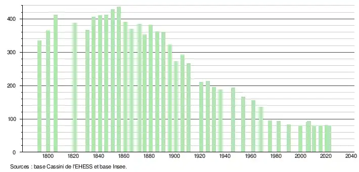 L'évolution du nombre d'habitants est connue à travers les recensements de la population effectués dans la commune depuis 1793. Pour les communes de moins de 10 000 habitants, une enquête de recensement portant sur toute la population est réalisée tous les cinq ans, les populations de référence des années intermédiaires étant quant à elles estimées par interpolation ou extrapolation[28]. Pour la commune, le premier recensement exhaustif entrant dans le cadre du nouveau dispositif a été réalisé en 2005[29].