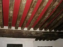 - On observera sur les chevrons apparents du plafond de cette pièce ainsi que sur deux des quatre poutres maîtresses sur lesquelles ils reposent, sont peints des monogrammes polychromes inlassablement répétés qui semblent être formés de deux D inversés et entrelacés, d’un M et d’un P, dont la signification n’a pas été découverte à ce jour (ces inscriptions couvertes par des siècles de suie ont été mises au jour, après sablage, par les derniers propriétaires).