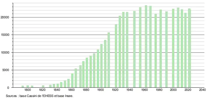 - ↑ Par convention dans Wikipédia, le principe a été retenu de n’afficher dans le tableau des recensements et le graphique, pour les populations de référence postérieures à 1999, que les populations correspondant à une enquête exhaustive de recensement pour les communes de moins de 10 000 habitants, et que les populations des années 2006, 2011, 2016, etc. pour les communes de plus de 10 000 habitants, ainsi que la dernière population de référence publiée par l’Insee pour l'ensemble des communes.
