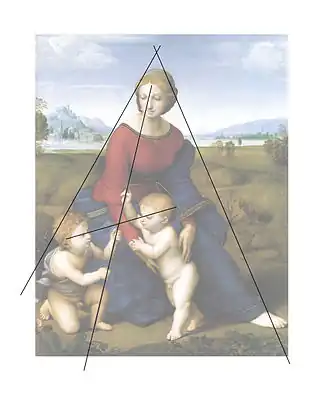 La composition fluide et de forme pyramidale montrant les protagonistes liés par des échanges de regards et de gestes témoigne d'une évidente influence des modèles leonardesques comme La Vierge, l'Enfant Jésus et sainte Anne, mais s'en écarte en remplaçant le sens du mystère et l'inquiétante charge d'illusions et suggestions par une sensation de calme et une familiarité spontanée.