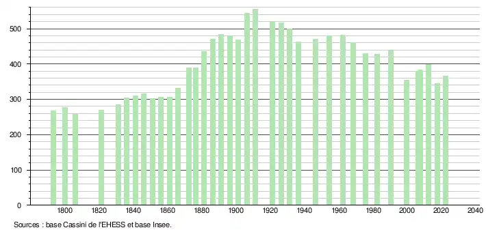 - ↑ Population municipale de référence en vigueur au 1er janvier 2025, millésimée 2022, définie dans les limites territoriales en vigueur au 1er janvier 2024, date de référence statistique : 1er janvier 2022.