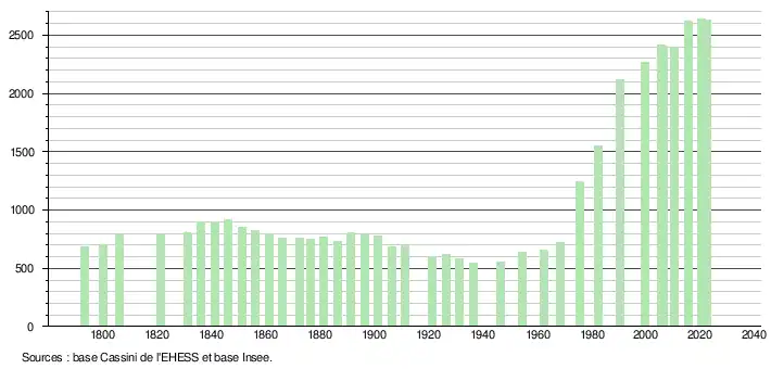 L'évolution du nombre d'habitants est connue à travers les recensements de la population effectués dans la commune depuis 1793. Pour les communes de moins de 10 000 habitants, une enquête de recensement portant sur toute la population est réalisée tous les cinq ans, les populations de référence des années intermédiaires étant quant à elles estimées par interpolation ou extrapolation[26]. Pour la commune, le premier recensement exhaustif entrant dans le cadre du nouveau dispositif a été réalisé en 2005[27].