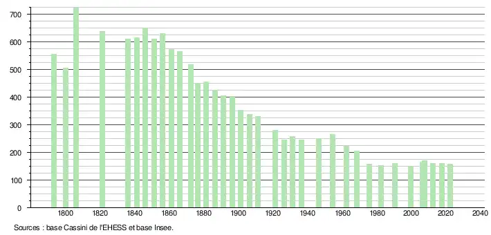 L'évolution du nombre d'habitants est connue à travers les recensements de la population effectués dans la commune depuis 1793. Pour les communes de moins de 10 000 habitants, une enquête de recensement portant sur toute la population est réalisée tous les cinq ans, les populations de référence des années intermédiaires étant quant à elles estimées par interpolation ou extrapolation[21]. Pour la commune, le premier recensement exhaustif entrant dans le cadre du nouveau dispositif a été réalisé en 2007[22].