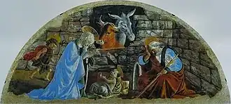 - La Vierge à l'Enfant soutenu par un ange sous une guirlande