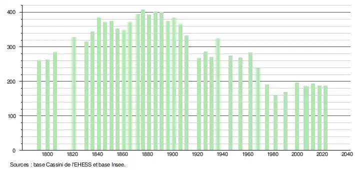 L'évolution du nombre d'habitants est connue à travers les recensements de la population effectués dans la commune depuis 1793. Pour les communes de moins de 10 000 habitants, une enquête de recensement portant sur toute la population est réalisée tous les cinq ans, les populations de référence des années intermédiaires étant quant à elles estimées par interpolation ou extrapolation[27]. Pour la commune, le premier recensement exhaustif entrant dans le cadre du nouveau dispositif a été réalisé en 2007[28].