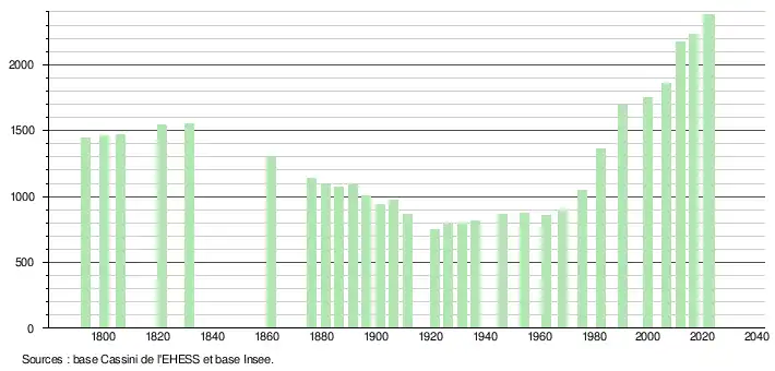 L'évolution du nombre d'habitants est connue à travers les recensements de la population effectués dans la commune depuis 1793. Pour les communes de moins de 10 000 habitants, une enquête de recensement portant sur toute la population est réalisée tous les cinq ans, les populations de référence des années intermédiaires étant quant à elles estimées par interpolation ou extrapolation[24]. Pour la commune, le premier recensement exhaustif entrant dans le cadre du nouveau dispositif a été réalisé en 2006[25].