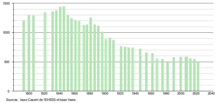 L'évolution du nombre d'habitants est connue à travers les recensements de la population effectués dans la commune depuis 1793. Pour les communes de moins de 10 000 habitants, une enquête de recensement portant sur toute la population est réalisée tous les cinq ans, les populations de référence des années intermédiaires étant quant à elles estimées par interpolation ou extrapolation[36]. Pour la commune, le premier recensement exhaustif entrant dans le cadre du nouveau dispositif a été réalisé en 2007[37].
