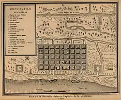 Les plans de La Nouvelle-Orléans furent dessinés par Adrien de Pauger et Le Blond de la Tour sur le modèle traditionnel des villes nouvelles, c'est-à-dire un damier symétrique, dont la taille maximale devait être de 88 hectares divisés en 66 îlots[11], avec une place où se trouvaient l’église (la future cathédrale Saint-Louis), la maison du gouverneur et des casernes. Sur les quais furent aménagés des magasins, un hôpital et le couvent des Ursulines. C'est notamment Adrien de Pauger qui dessina les plans du Vieux Carré avec ses rues à angle droit. La construction s'avéra très difficile à cause du climat, mais aussi des forêts denses qui occupaient le site : l'ouragan de 1722 causa d'énormes dommages[12]. Le manque de main-d'œuvre, les épidémies et les moustiques ralentirent également les travaux. Le creusement du chenal démarra en 1723.