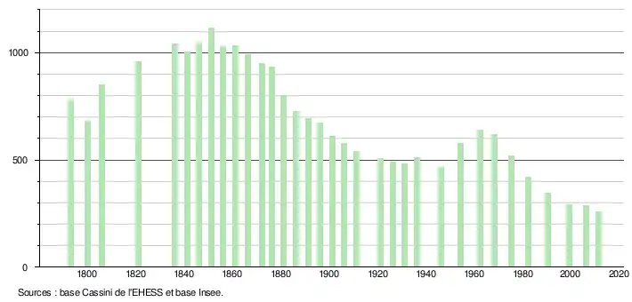 L'évolution du nombre d'habitants est connue à travers les recensements de la population effectués dans la commune depuis 1793. À partir du , les populations légales des communes sont publiées annuellement dans le cadre d'un recensement qui repose désormais sur une collecte d'information annuelle, concernant successivement tous les territoires communaux au cours d'une période de cinq ans. Pour les communes de moins de 10 000 habitants, une enquête de recensement portant sur toute la population est réalisée tous les cinq ans, les populations légales des années intermédiaires étant quant à elles estimées par interpolation ou extrapolation[9]. Pour la commune, le premier recensement exhaustif entrant dans le cadre du nouveau dispositif a été réalisé en 2006[10],[Note 2].