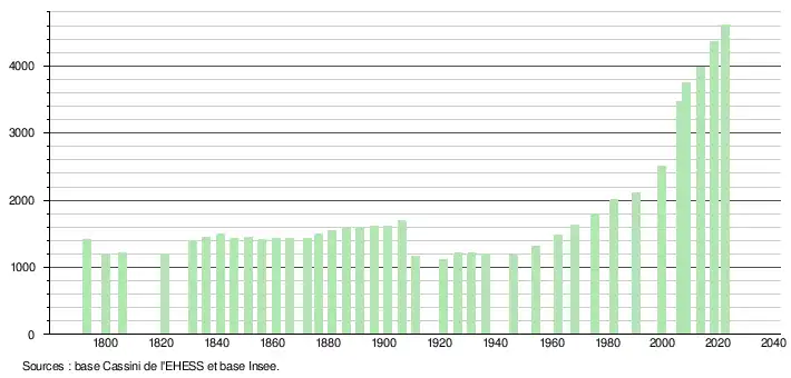 L'évolution du nombre d'habitants est connue à travers les recensements de la population effectués dans la commune depuis 1793. Pour les communes de moins de 10 000 habitants, une enquête de recensement portant sur toute la population est réalisée tous les cinq ans, les populations de référence des années intermédiaires étant quant à elles estimées par interpolation ou extrapolation[23]. Pour la commune, le premier recensement exhaustif entrant dans le cadre du nouveau dispositif a été réalisé en 2008[24].