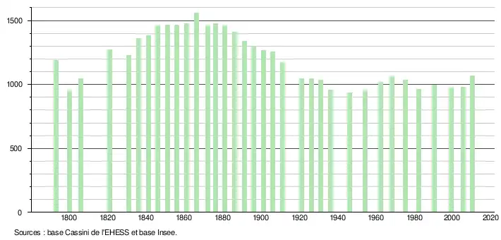 L'évolution du nombre d'habitants est connue à travers les recensements de la population effectués dans la commune depuis 1793. À partir du , les populations légales des communes sont publiées annuellement dans le cadre d'un recensement qui repose désormais sur une collecte d'information annuelle, concernant successivement tous les territoires communaux au cours d'une période de cinq ans. Pour les communes de moins de 10 000 habitants, une enquête de recensement portant sur toute la population est réalisée tous les cinq ans, les populations légales des années intermédiaires étant quant à elles estimées par interpolation ou extrapolation[11]. Pour la commune, le premier recensement exhaustif entrant dans le cadre du nouveau dispositif a été réalisé en 2005[12],[Note 2].